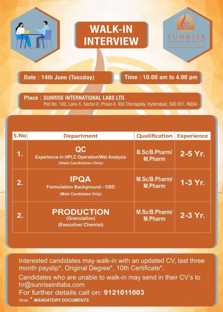 Sunrise International Walk-In Interviews for Quality Control / Production & IPQA on 14th June’ 2022