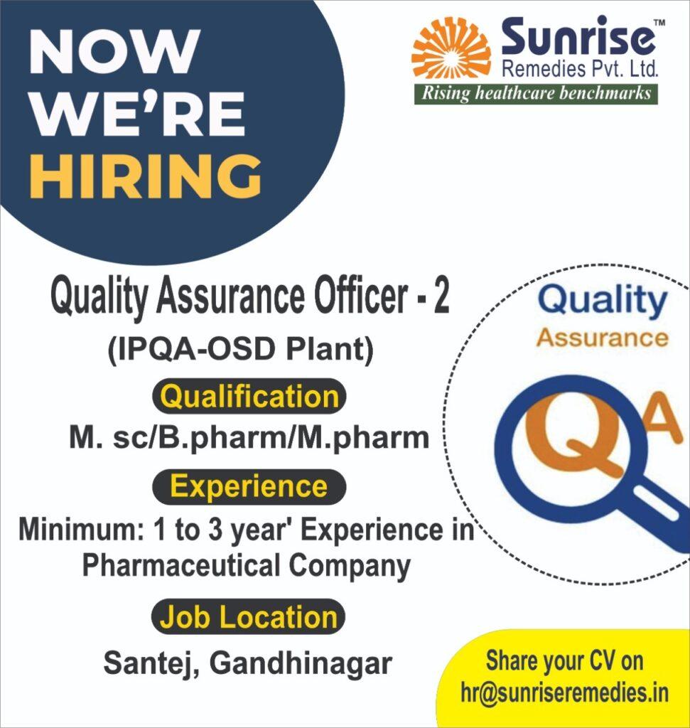 Sunrise Remedies Pvt. Ltd. hiring Quality Assurance Officer – IPQA- OSD Plant at Santej, Gandhinagar