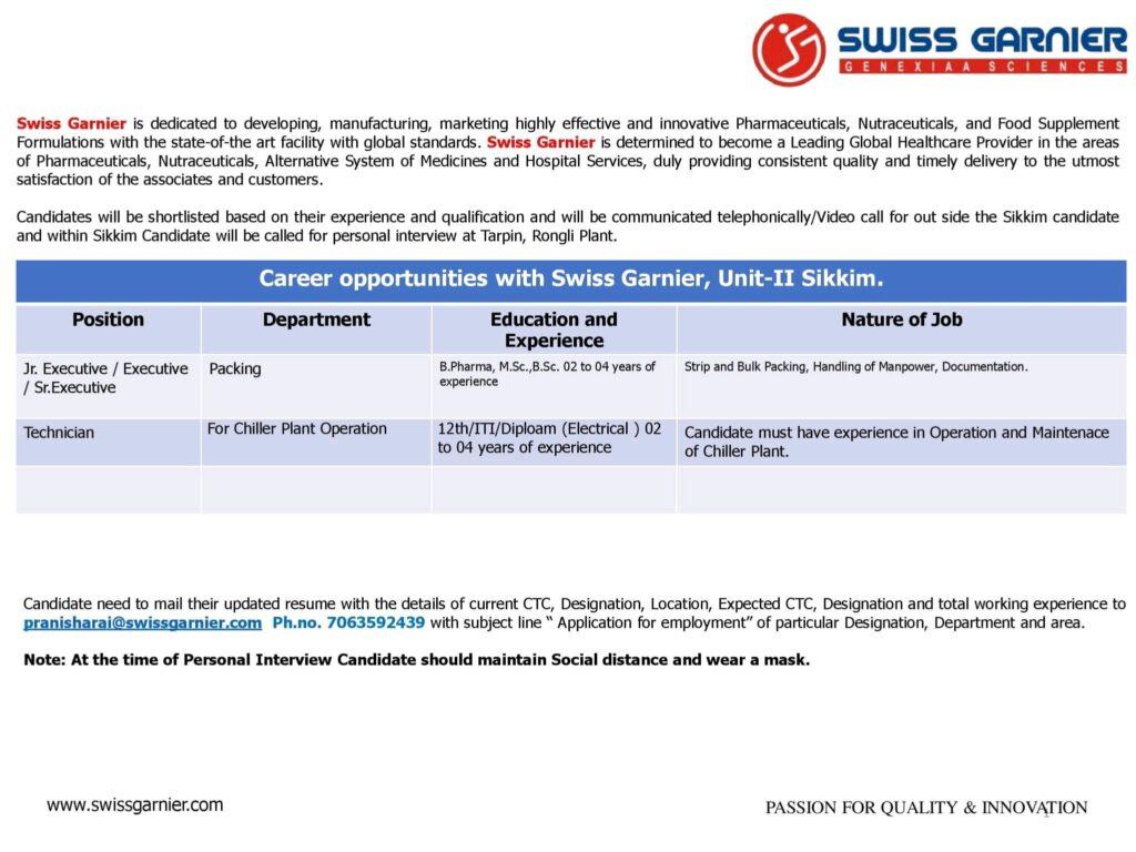 swiss Garnier Unit II Sikkim location is currently looking for the below position.