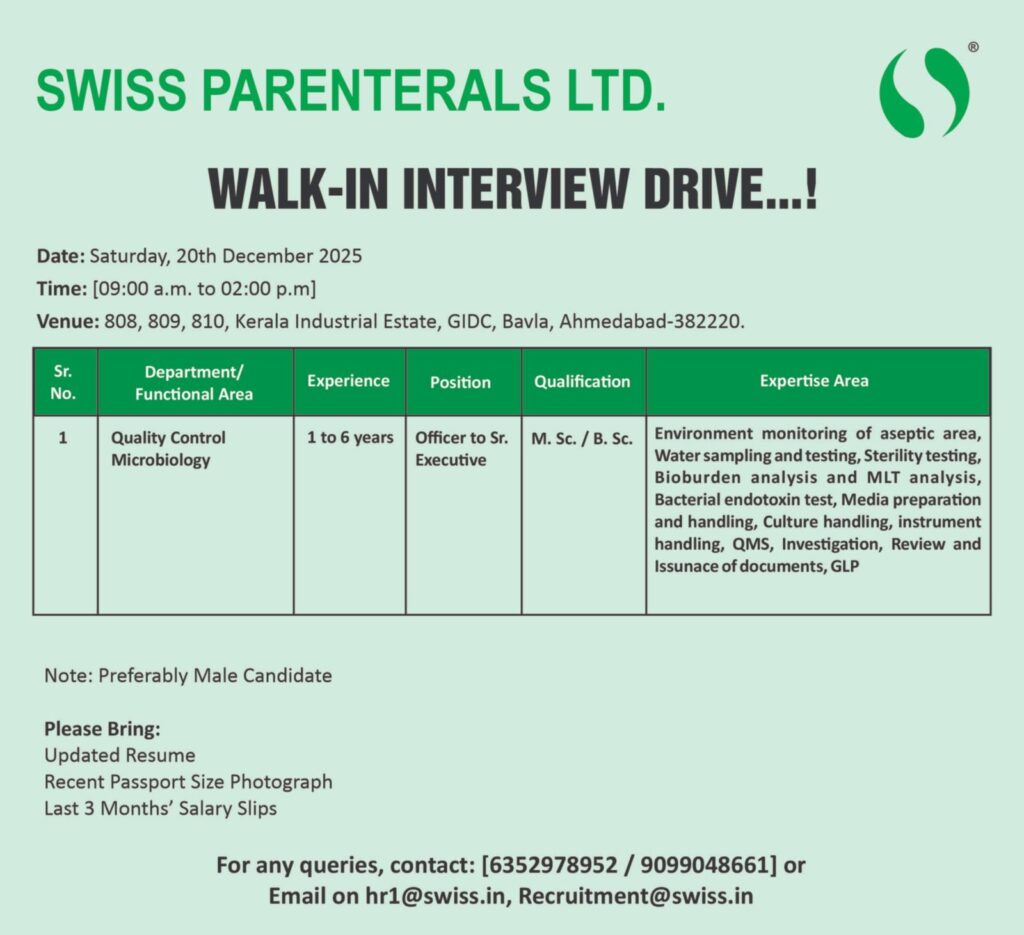 Pharmaceutical professionals in Gujarat have a significant opportunity to advance their careers this weekend. Two leading companies, Swiss Parenterals Ltd. and Avantika Medex, are conducting walk-in interview drives on Saturday, 20th December 2025, for various positions within their Quality Control departments.