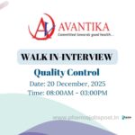 Avantika Medex is inviting candidates for multiple levels within their Quality Control department at their Sanand facility.