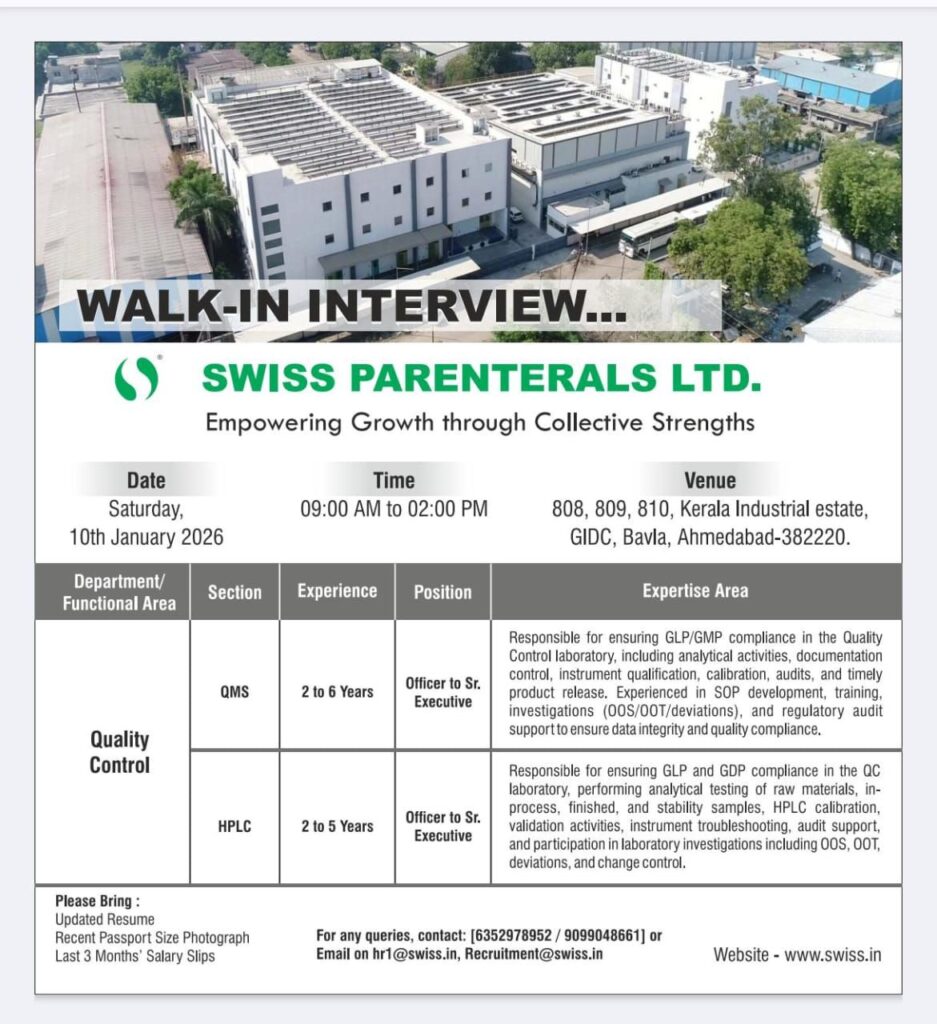Swiss Parenterals Ltd. is inviting skilled professionals to join its growing team through a walk-in interview drive scheduled for January 2026. The company, known for its focus on collective growth and excellence in the pharmaceutical sector, is looking for experienced candidates to fill key roles within its Quality Control department.