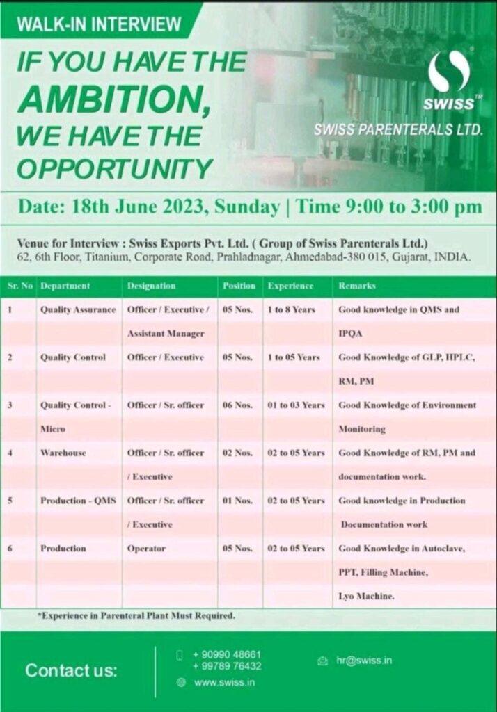 Venue for Interview: Swiss Exports Pvt. Ltd. (Group of Swiss Parenterals Ltd.) 62, 6th Floor, Titanium, Corporate Road, Prahladnagar, Ahmedabad-380 015, Gujarat, INDIA.