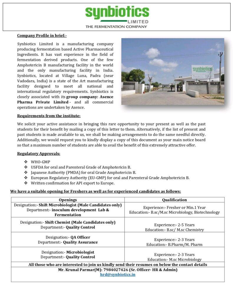 Synbiotics Limited- Hiring Fresher & experience B.sc/ M.sc Microbiology, Biotechnology/ B.Pharm/ M. Pharm – Microbiologist, QC, QA & Shift Chemist