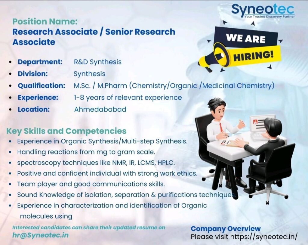 Qualification: M.Sc. / M.Pharm (Chemistry/Organic /Medicinal Chemistry)