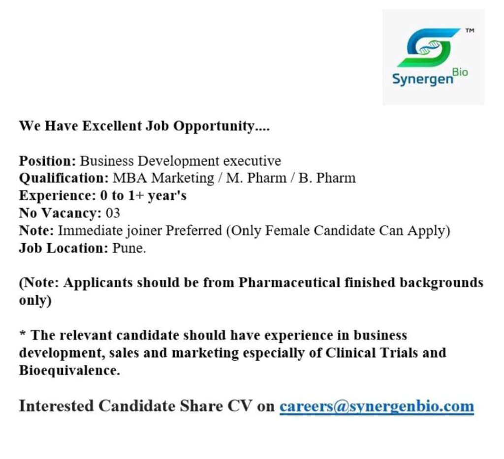 Interested Candidate Share CV on careers@synergenbio.com