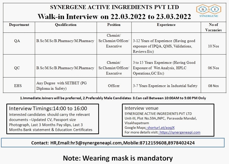 Synergene Active Ingredients Pvt. Ltd. Walk In Interview for Quality Assurance / Quality Control & EHS on 22nd & 23rd March 2022