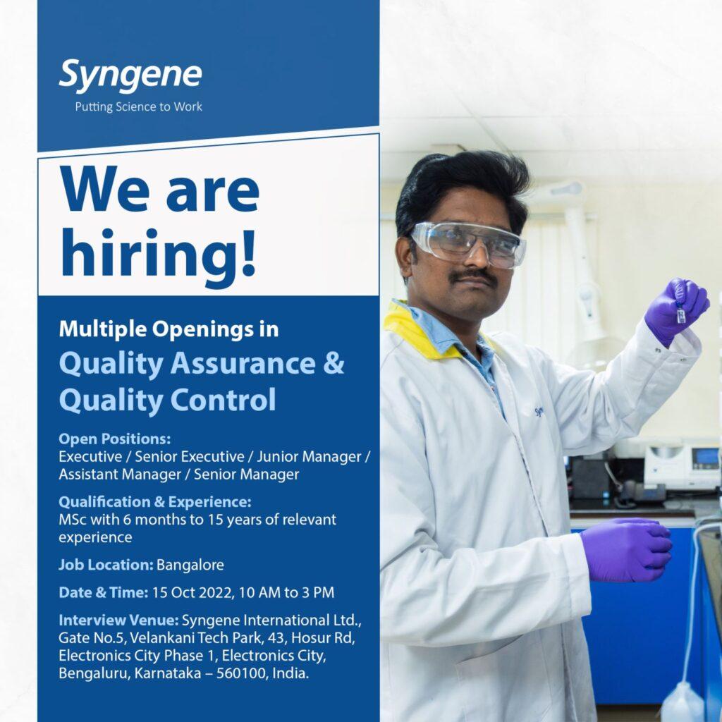 Syngene International Limited conducting walk-in interviews on 15th October 2022 for multiple openings in the Quality team – Quality Assurance & Quality Control department