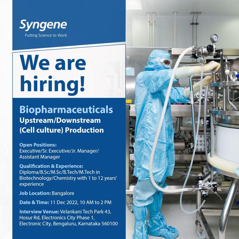 Syngene International Limited conducting walk-in interviews on 11th December 2022 for multiple openings in biologics operations (upstream/downstream – production)