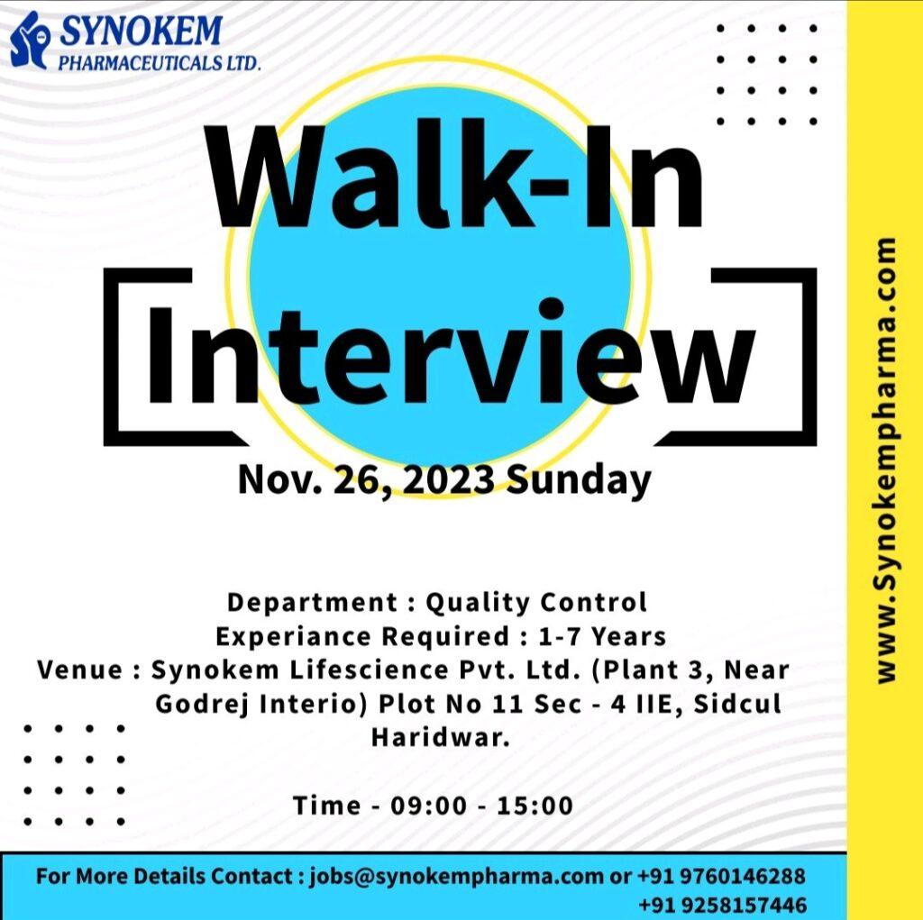 Synokem Lifescience Walk-In Interview on Nov. 26, 2023 Sunday for Quality Control department at Sidcul Haridwar