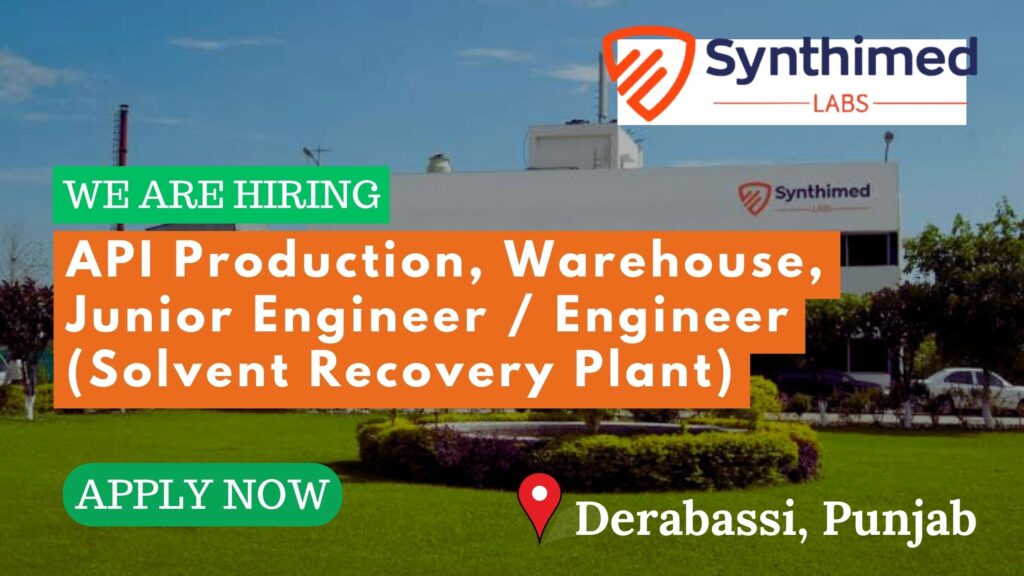 Synthimed Labs hiring for API Production, Warehouse, Junior Engineer / Engineer (Solvent Recovery Plant) Apply Now