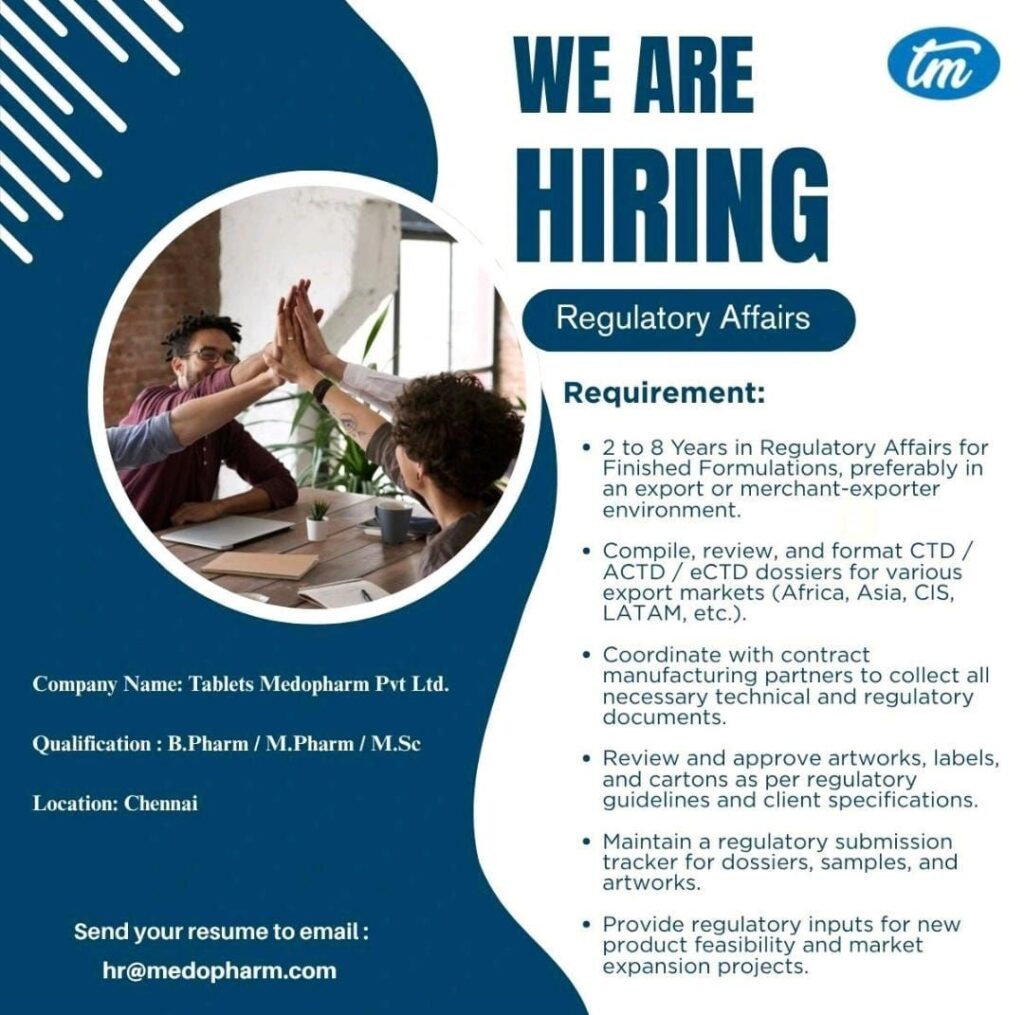 Tablets Medopharm Pvt. Ltd., a reputed pharmaceutical company, has announced exciting job openings in the Regulatory Affairs Department. The company is seeking qualified and experienced professionals to join its team in Chennai.