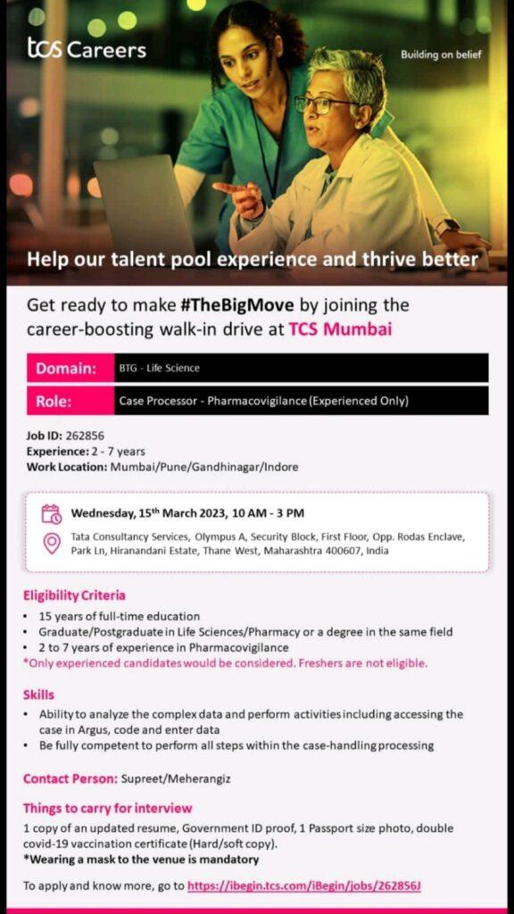 Tata Consultancy Services- Walk In Drive for Case Processor – Pharmacovigilance on 15th March 2023