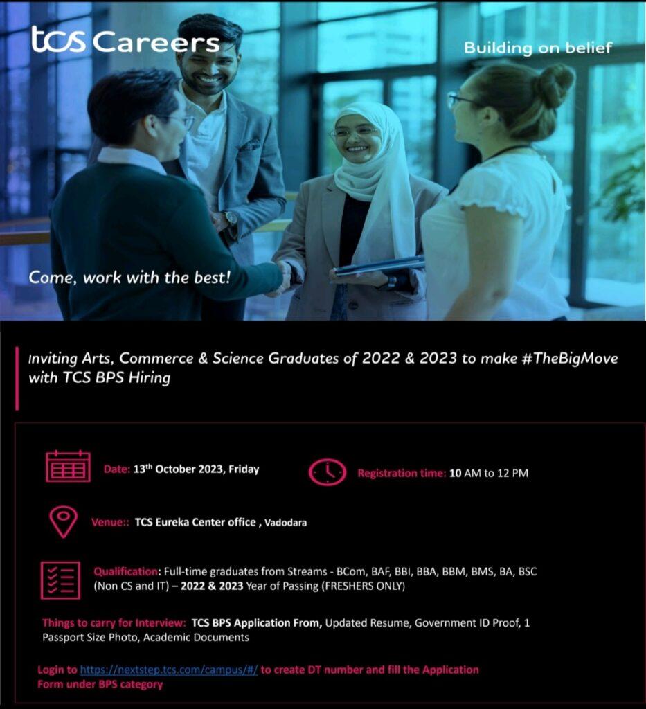 TCS Campus team is conducting a Walk-in drive for BPS Fresher hiring at TCS Vadodara office on 13th October 2023.