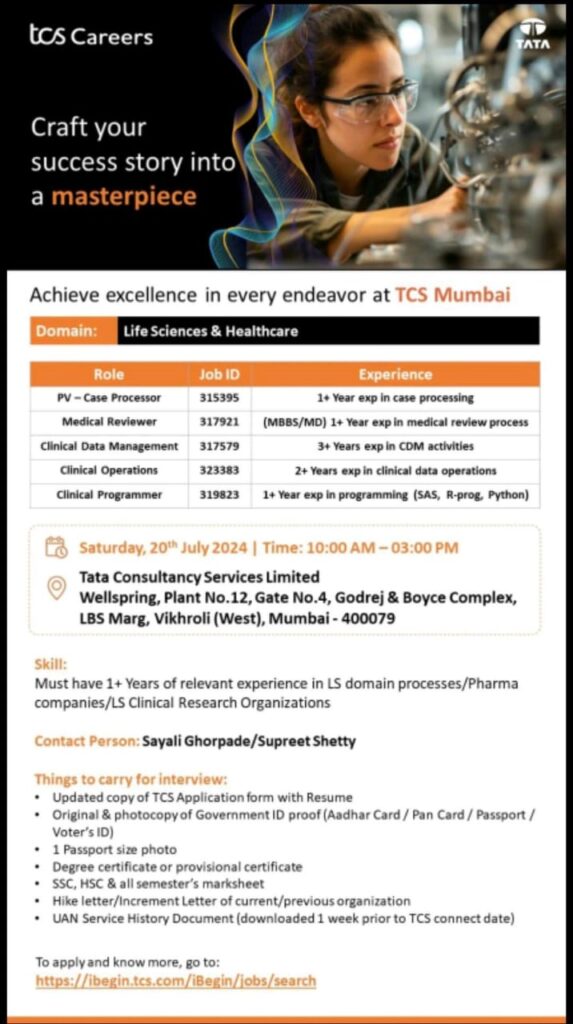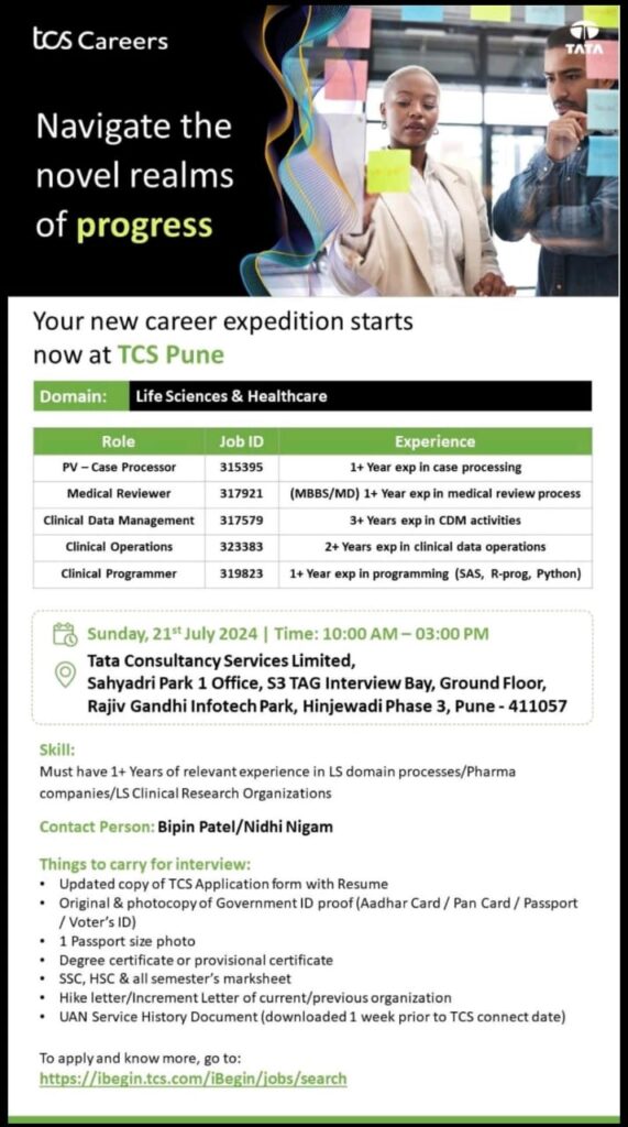 TCS walk in for PV-Case Processor, Medical Reviewer, CDM, Clinical Operations & Clinical Programmer on 20th & 21st July 2024