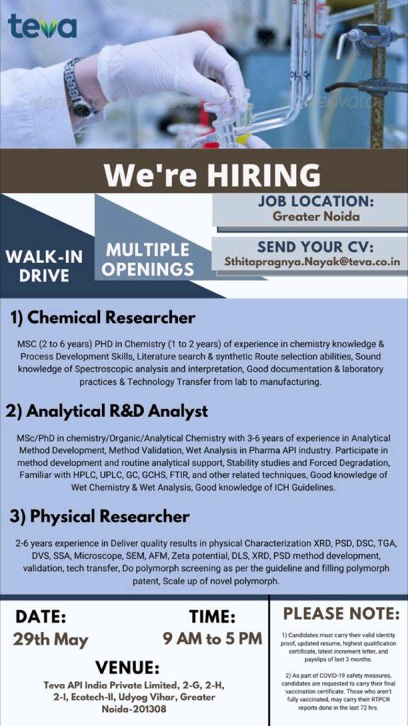 Teva API India Private Limited Walk In Interview for Chemical Researcher, Analytical R&D Analyst, Physical Researcher on 29th May 2022