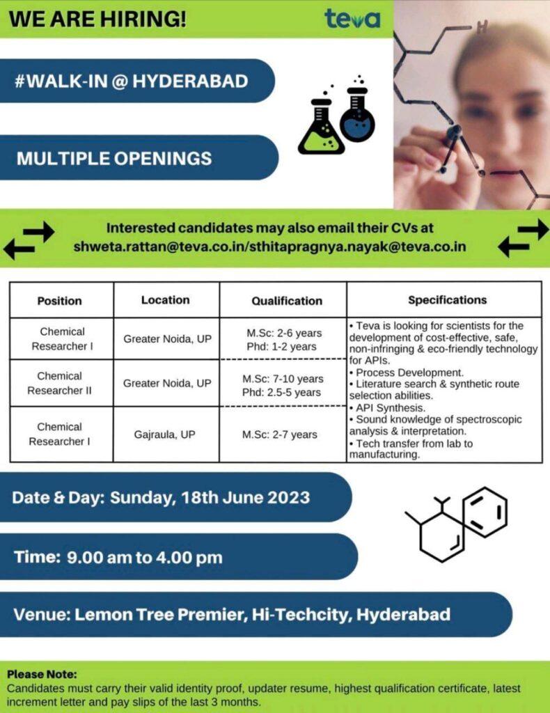 Teva Job vacancy for Chemical Researcher at Greater Noida & Gajraula location