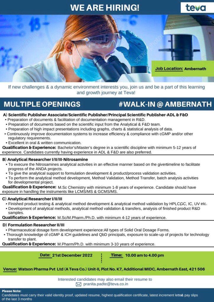 Teva Pharmaceuticals- Walk in drive at Ambernath for roles in Formulation Researcher & Analytical Researcher on 21st December 2022