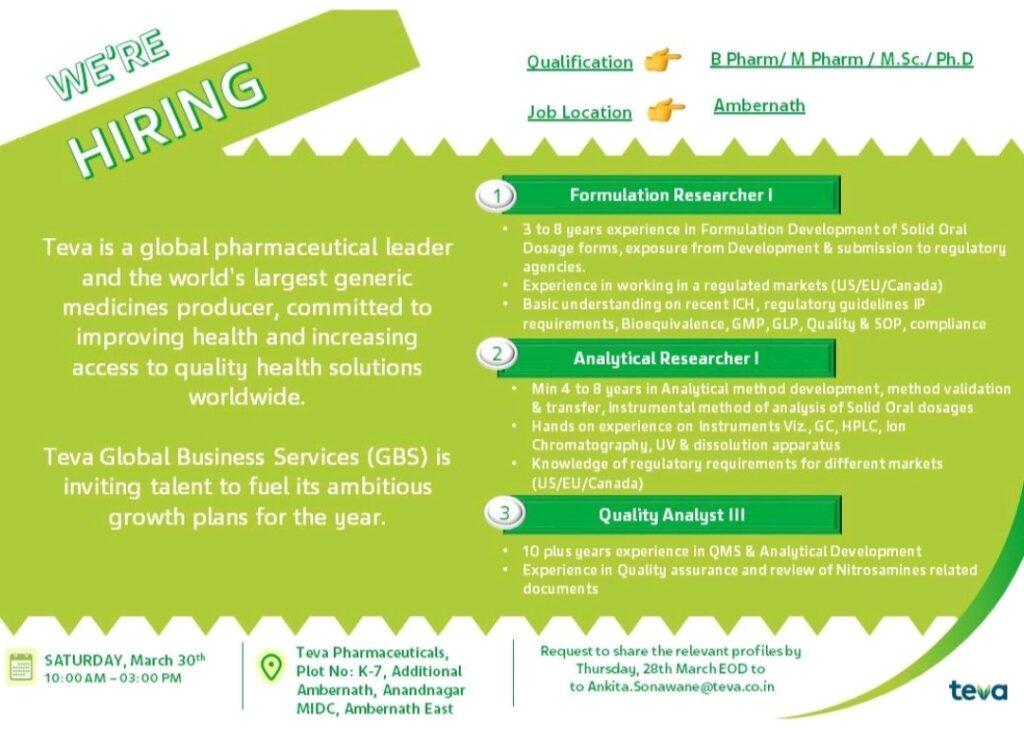 Teva Pharmaceuticals walk in interview for Formulation Researcher I/ Analytical Researcher I & Quality Analyst III on 30th March 2024