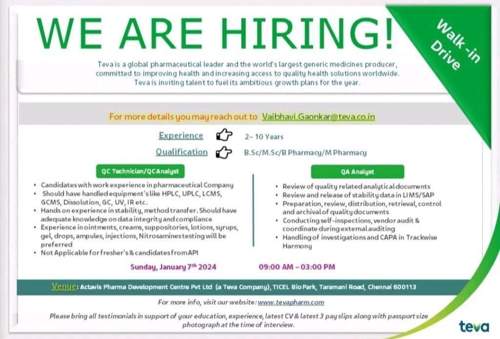 Teva Walk-in Drive for QA & QC department on Sunday, January 7th 2024