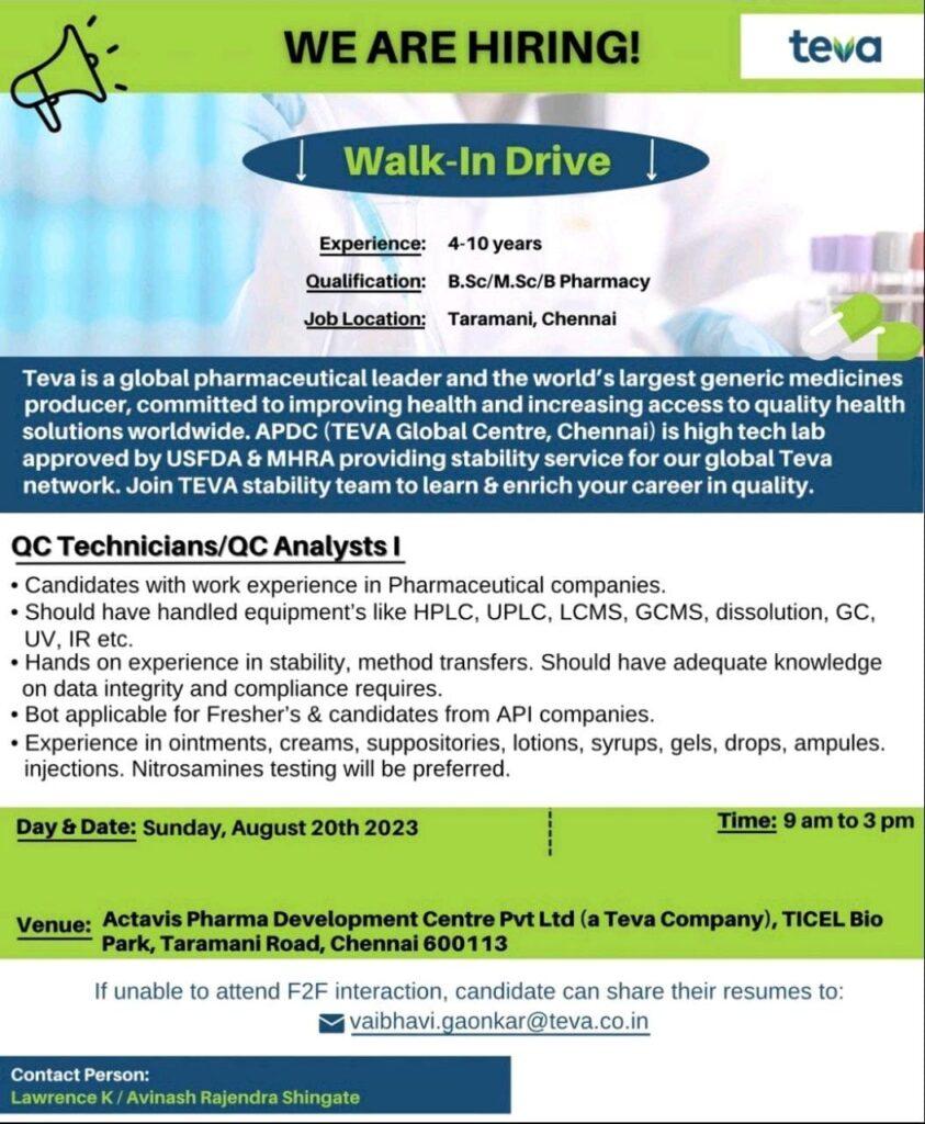 Teva is a global pharmaceutical leader and the world’s largest generic medicines producer, committed to improving health and increasing access to quality health solutions worldwide. APDC (TEVA Global Centre, Chennai) is high tech lab approved by USFDA & MHRA providing stability service for our global Teva network. Join TEVA stability team to learn & enrich your career in quality.