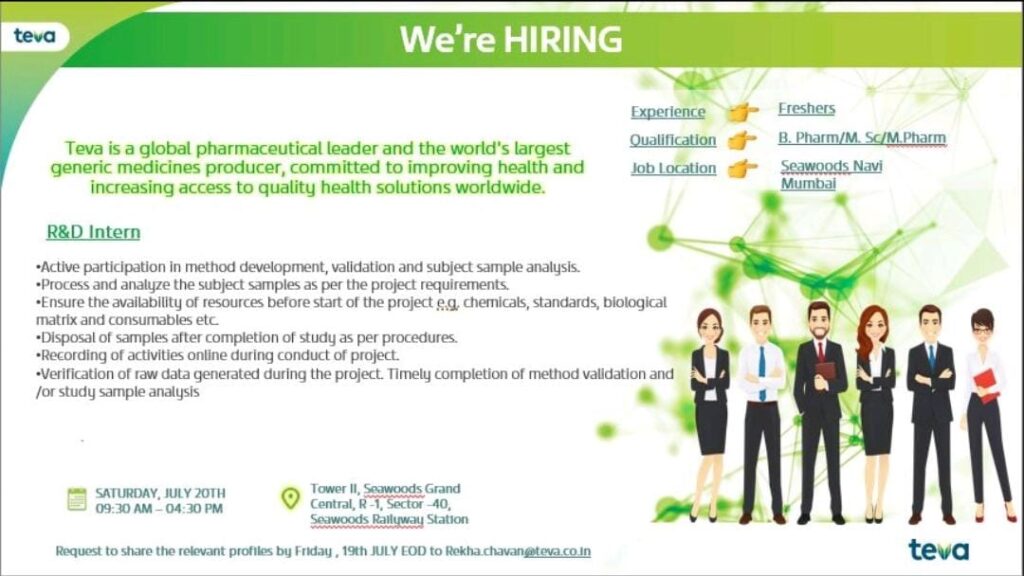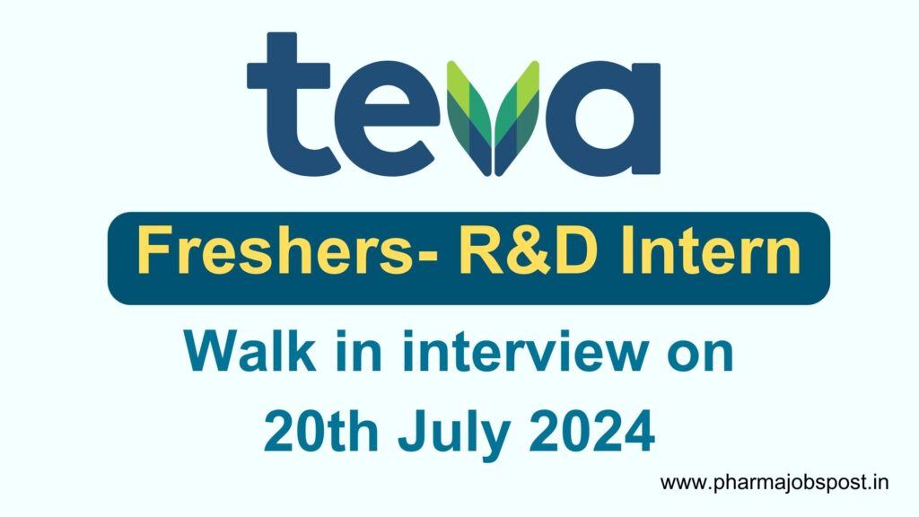 Teva walk in Interview for B.Pharm/M. Sc/M.Pharm Freshers in R&D Intern position on 20th July 2024