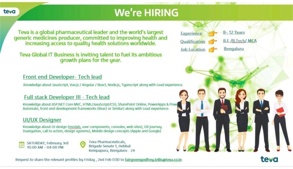 Teva walk in interview on 3rd February 2024 for Front end Developer, Full stack Developer III, UI/ UX Designer