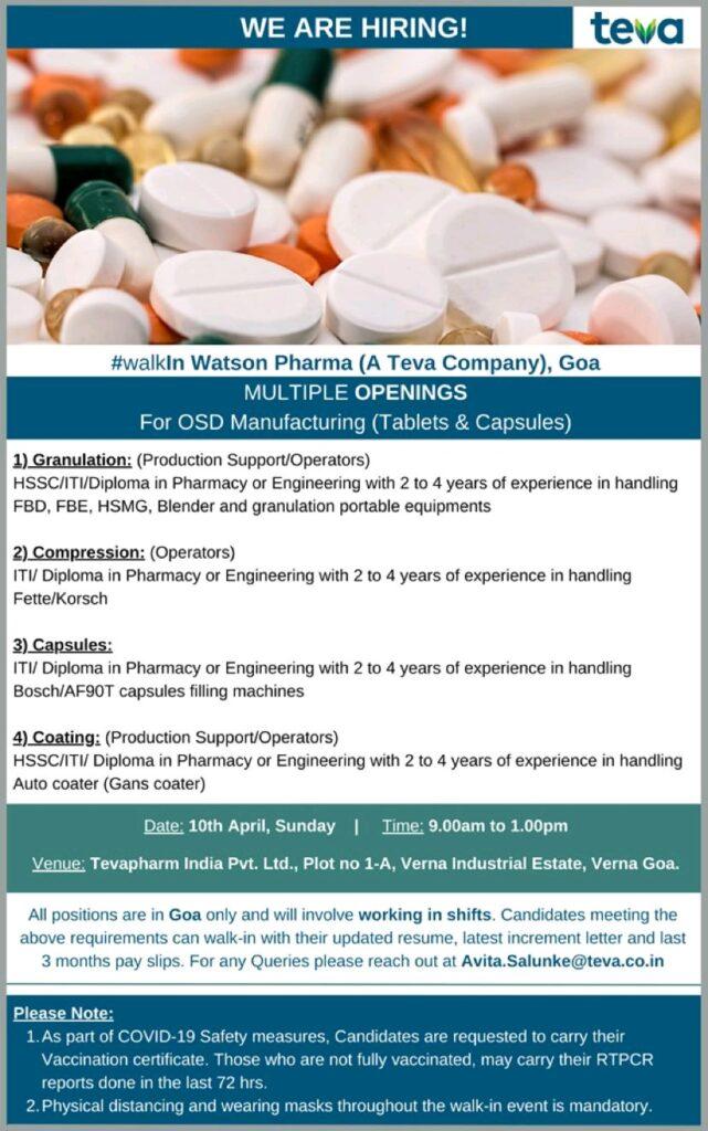 All positions are in Goa only and will involve working in shifts. Candidates meeting the above requirements can walk-in with their updated resume, latest increment letter and last 3 months pay slips. For any Queries please reach out at Avita.Salunke@teva.co.in