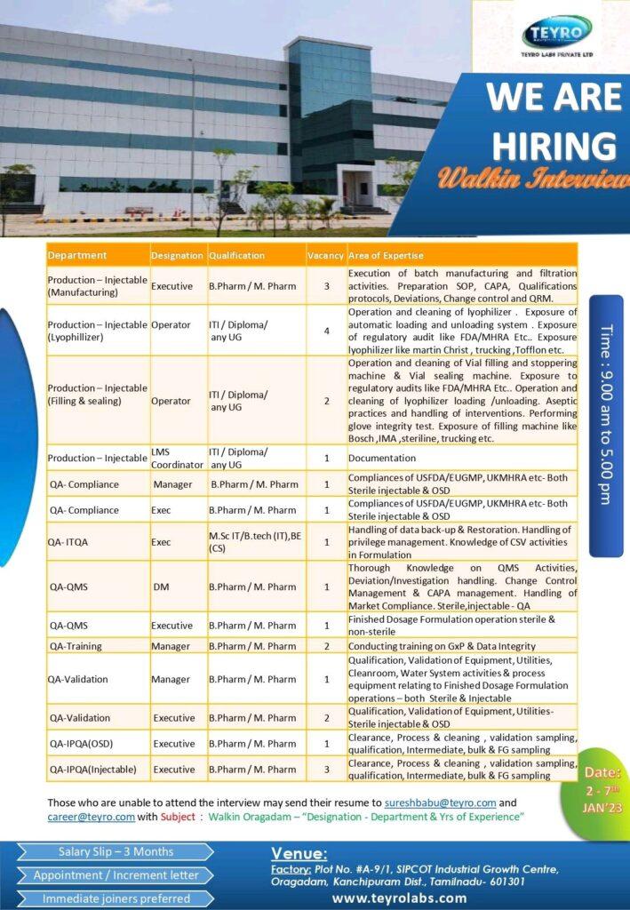 TEYRO PHARMA- Walk In Interview for Multiple opening in Production & QA on 2nd -7th JAN 23