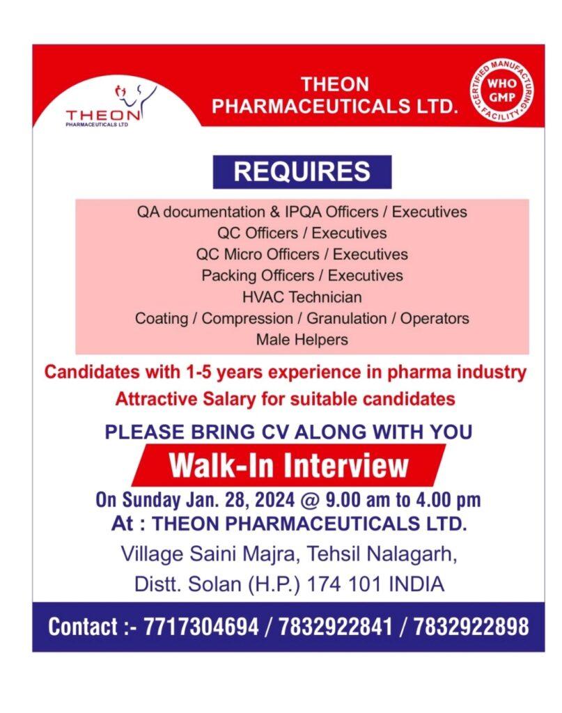 Theon Pharmaceuticals Ltd walk in interview for QA, QC, Micro, Packing & HVAC Technician, Coating / Compression / Granulation / Operators on Sunday Jan. 28, 2024