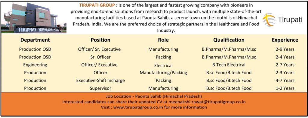 Tirupati group hiring for OSD Production & Engineering department at Paonta Sahib