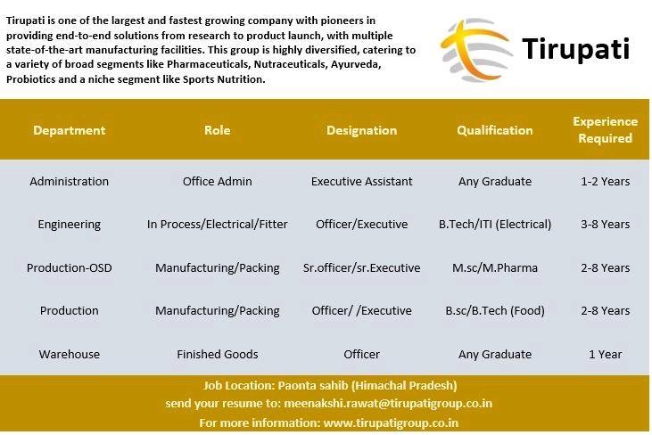 Tirupati Group is looking for multiple profiles – Administration / Engineering / Production-OSD /Production & Warehouse Department