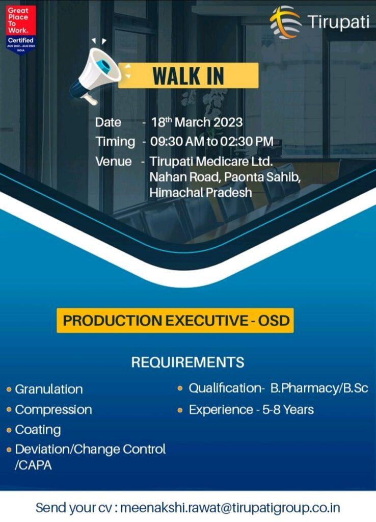 Tirupati Group Walk-Ins Drive for Production Department on 18th March 2023 (Saturday)