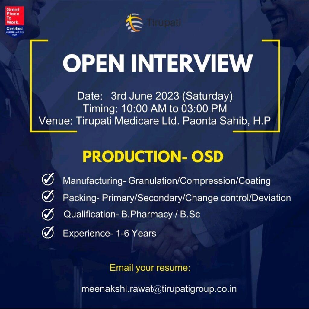 Tirupati Group Walk-Ins Drive for Production Department on 3rd June 2023 (Saturday)