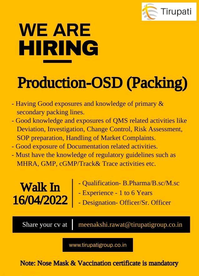 Tirupati hiring for Production-OSD (Packing) department ||Walk In on 16/04/2022