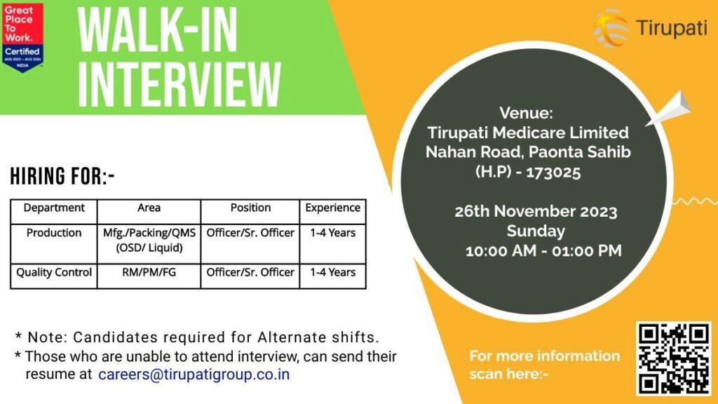 Tirupati Medicare walk in interview for Production, Quality Control on 26th November 2023