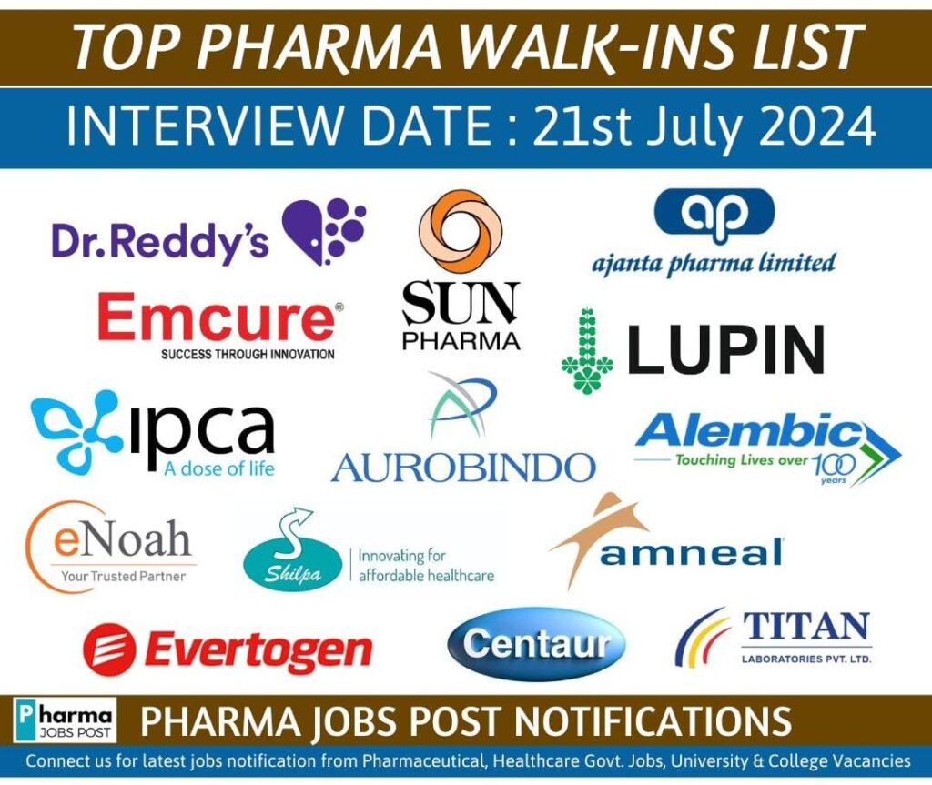 TOP 10 PHARMA WALK-INS INTERVIEW LIST – 21st July 2024