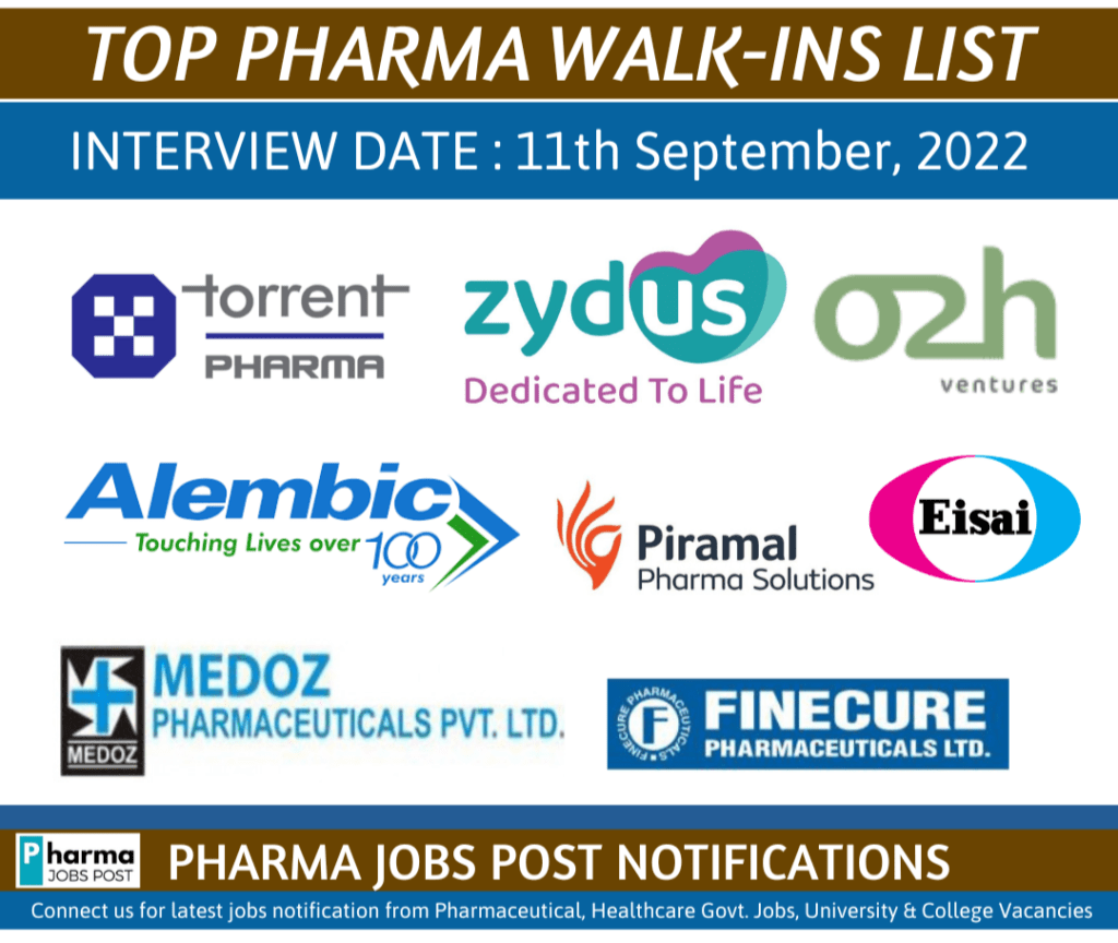 TOP PHARMA WALK-INS INTERVIEW LIST -11th September, 2022