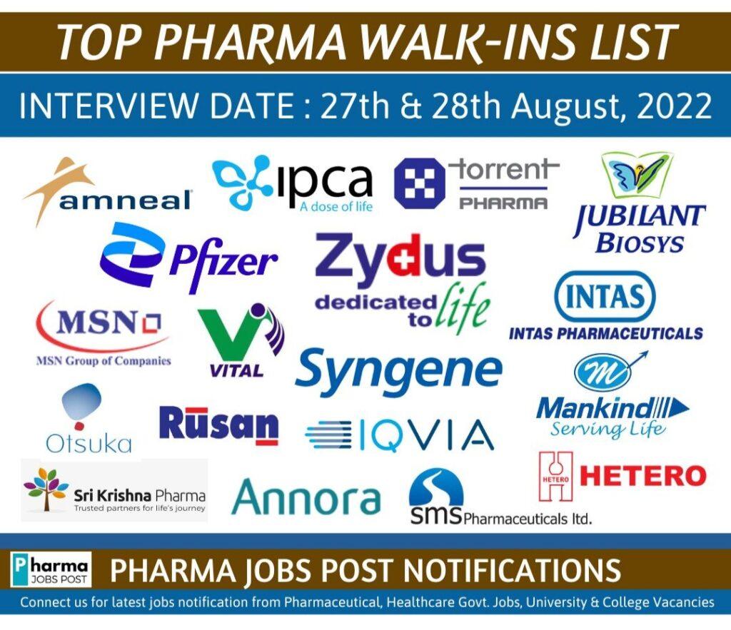 TOP PHARMA WALK-INS INTERVIEW LIST – 27th & 28th August, 2022 (Sunday)