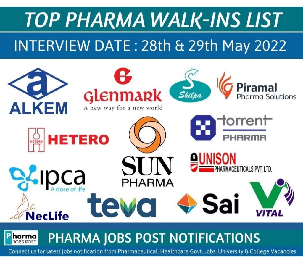 TOP PHARMA WALK-INS INTERVIEW LIST – 28th & 29th May 2022 (Sunday)