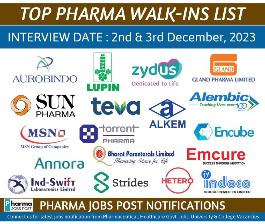 TOP PHARMA WALK-INS INTERVIEW LIST – 2nd & 3rd December, 2023