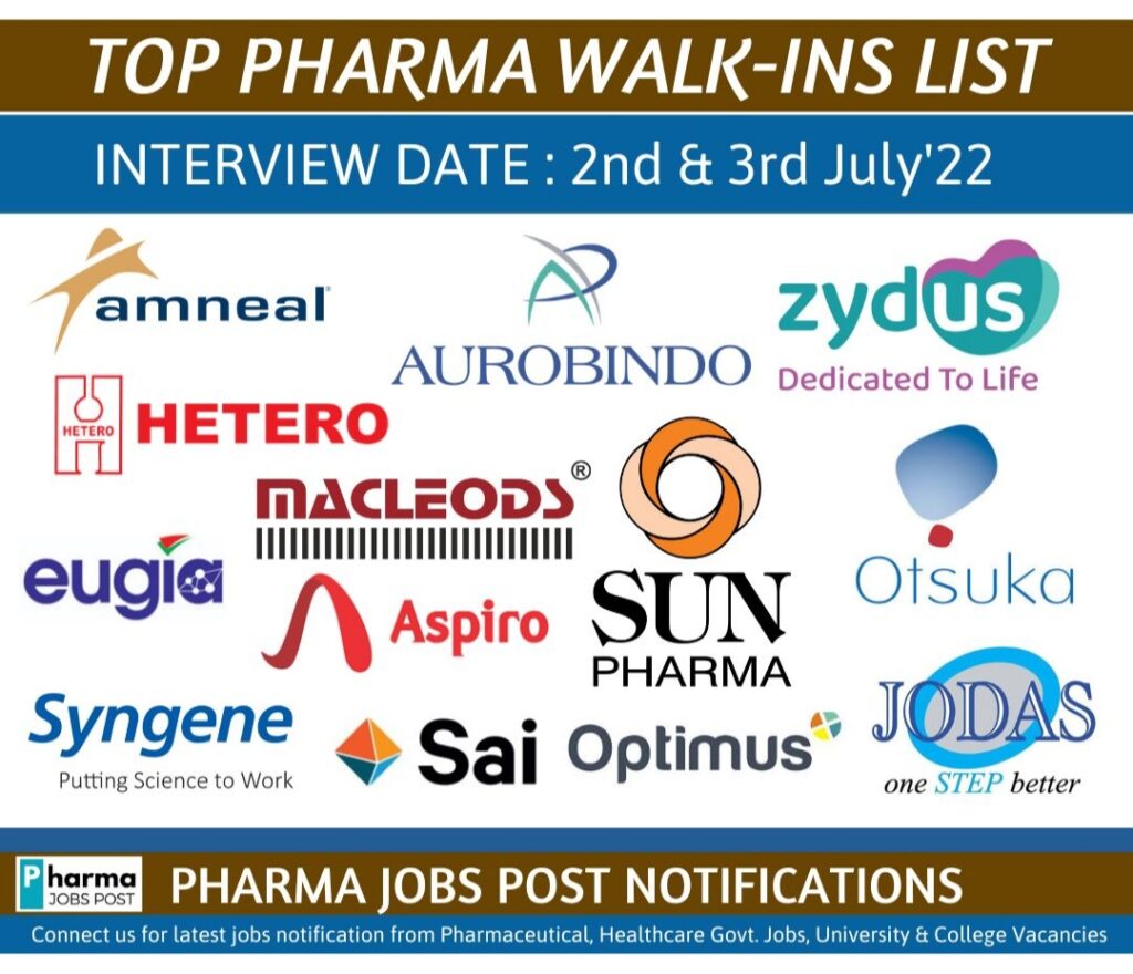 TOP PHARMA WALK-INS INTERVIEW LIST – 2nd & 3rd July’22