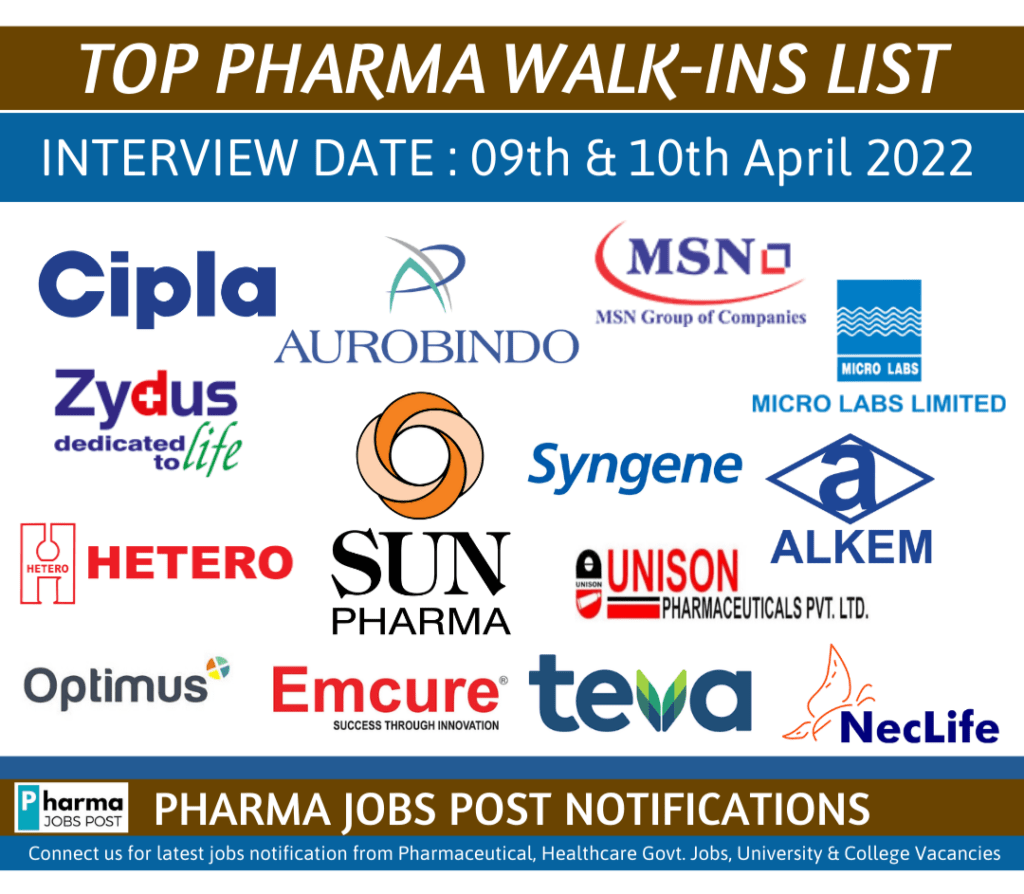 TOP PHARMA WALK-INS INTERVIEW LIST – 9th & 10th April 2022