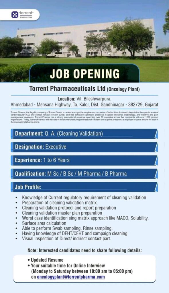 (Monday to Saturday between 10:00 am to 05:00 pm) on oncologyplant@torrentpharma.com