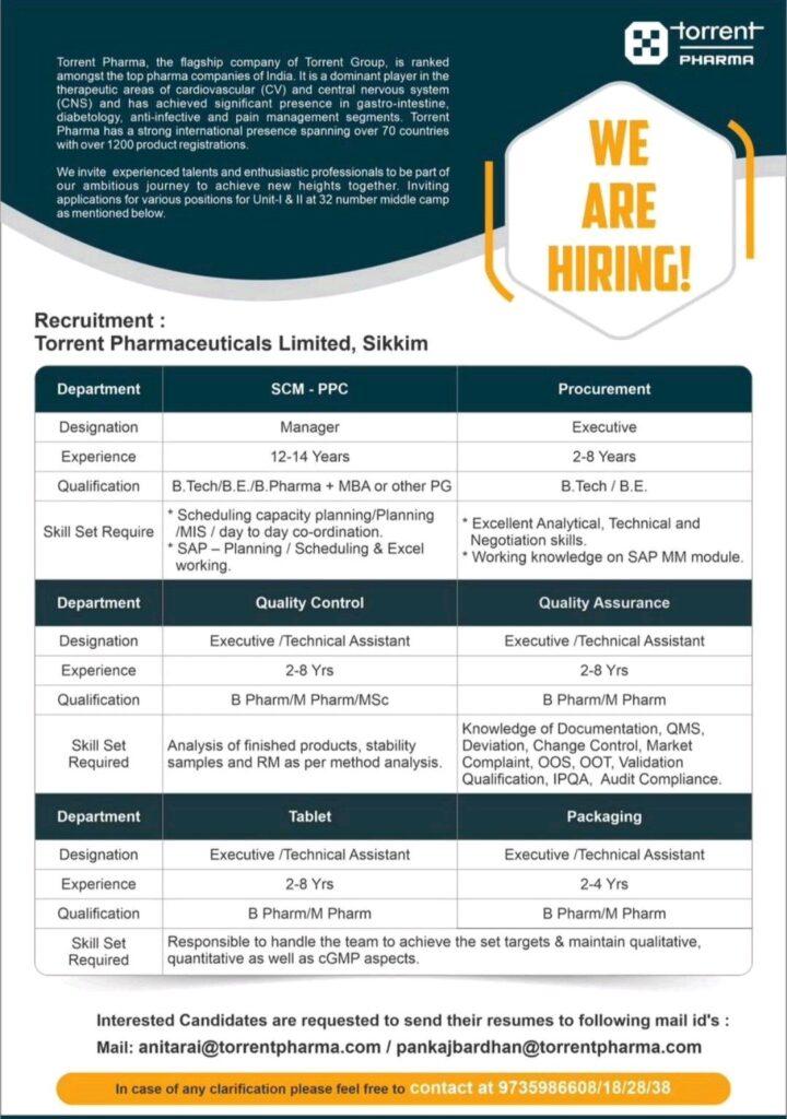 Interested Candidates are requested to send their resumes to following mail id’s: Mail: anitarai@torrentpharma.com/pankajbardhan@torrentpharma.com