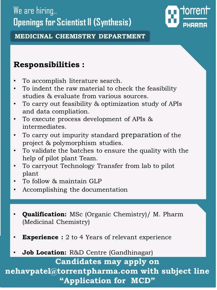 Torrent Pharma Openings for Scientist II (Synthesis) MEDICINAL CHEMISTRY DEPARTMENT