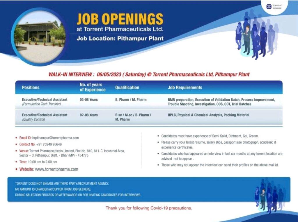 WALK-IN INTERVIEW: 06/05/2023 (Saturday) @ Torrent Pharmaceuticals Ltd, Pithampur Plant