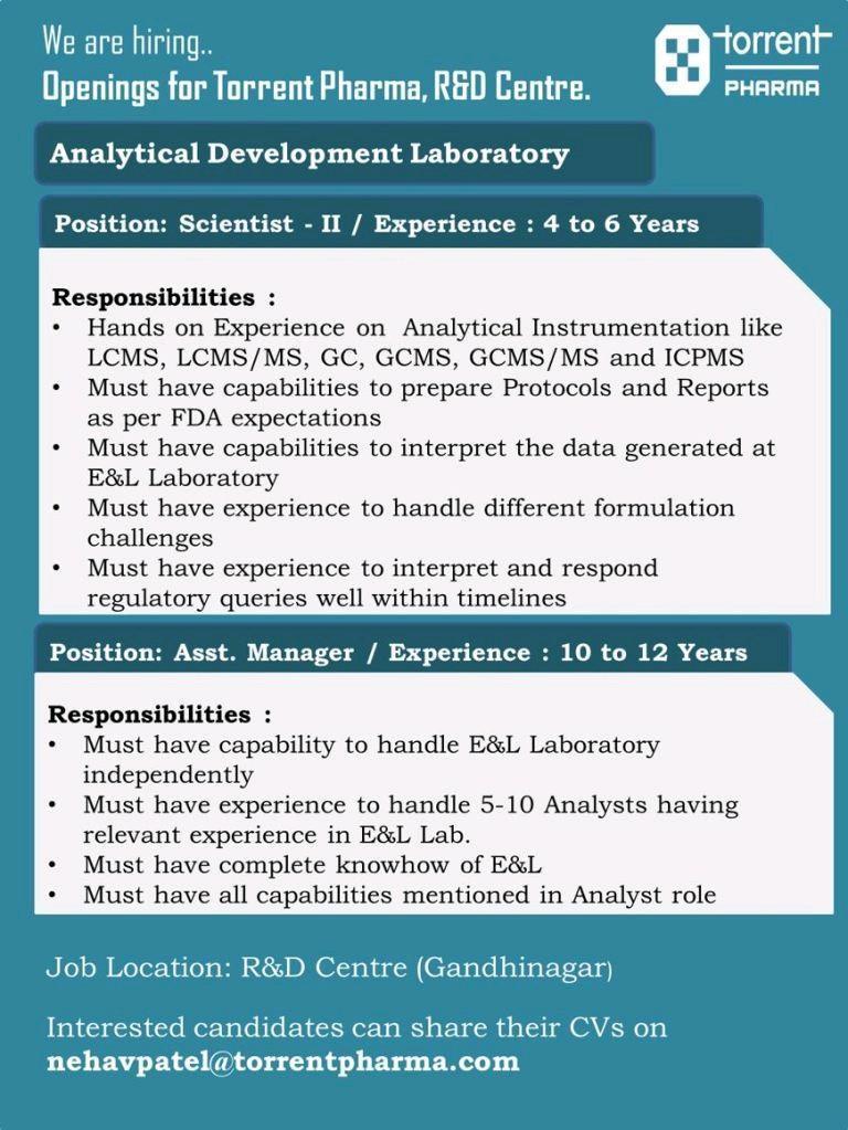 Torrent Pharma, R&D center is hiring for Scientist II and Assistant Manager position in Analytical Development Laboratory