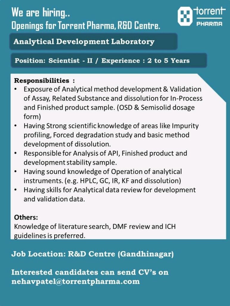 Interested candidates can send CV’s on nehavpatel@torrentpharma.com