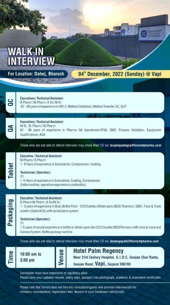 Those who are not able to attend interview may share their CV on tarjanipastagia@torrentpharma.com